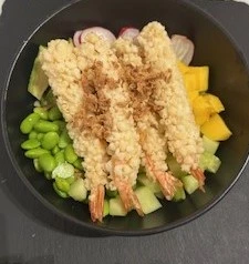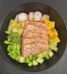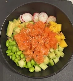 Riz vinaigré, Saumon, Avocat, Edamame, mangue, Concombre, tomate, oignons frits, sauce Teriyaki