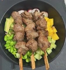 Riz vinaigré, Poulet Yakitori, Avocat, mangue, Concombre, tomate, Oignons frits