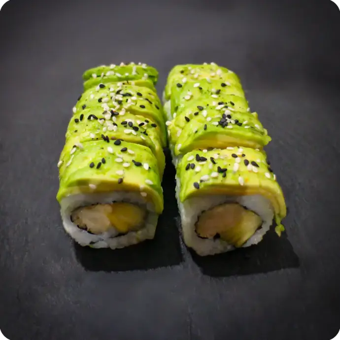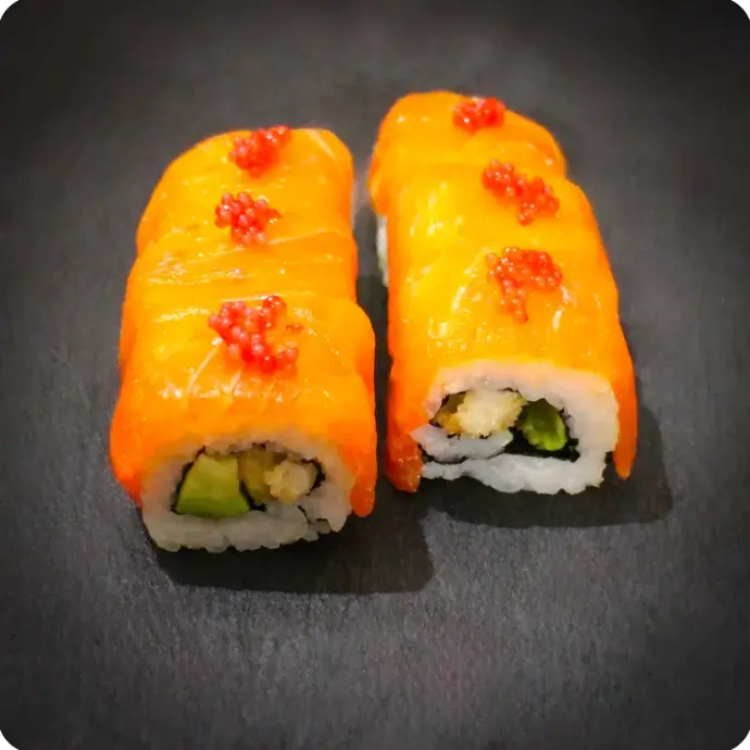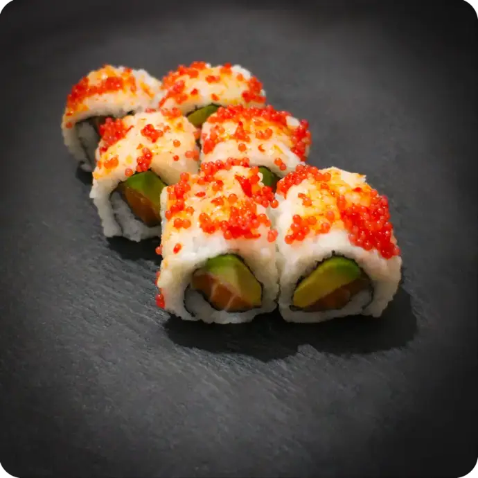 Saumon snacké Teriyaki, Crevette tempura, Avocat, Concombre, Masago .