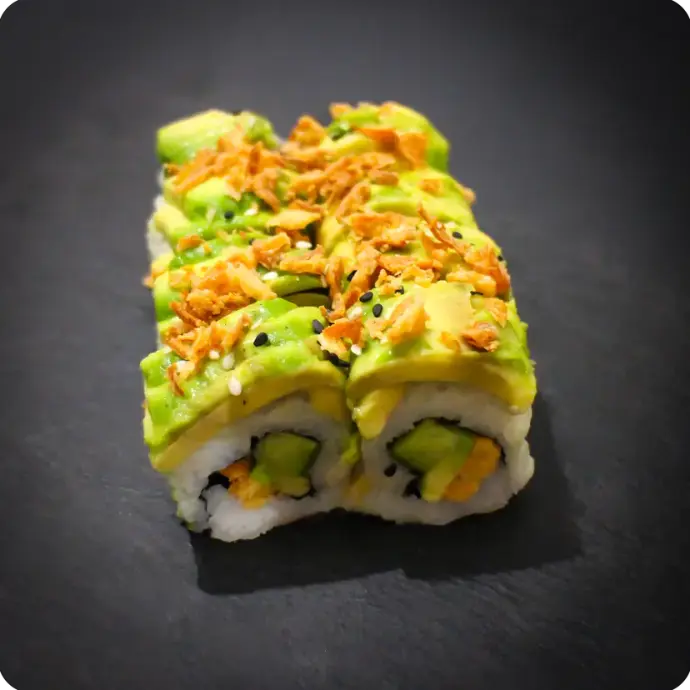 Crevette Tempura, Avocat, Mangue, Mayonnaise Spicy, masago, oignons frits.